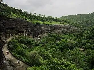 Aspeto das grutas de Ajanta, escavadas e transformadas em locais de culto budistas (viaras e chaityas), a maaior parte delas construídas sob o patrocínio do imperador Vakataka Harixena