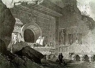 Vista exterior da gruta XIX de Ajanta numa gravura de James Fergusson no livro de 1845 “The Rock-cut Temples of India”