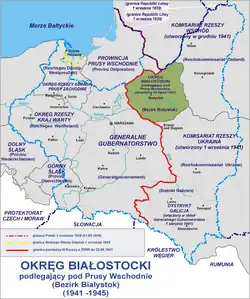 Até o final de julho de 1941, Białystok estava sob a gestão das autoridades militares, então foi subordinado à administração civil. O Distrito de Bialystok foi estabelecido em 1 de agosto de 1941; foi simultaneamente excluído das zonas operacionais do Exército Alemão na União Soviética. De então até 1944, a Gestapo e a SS se envolveram em execuções na área, por exemplo, nas florestas de Nowosiółki perto de Choroszcz, onde 4.000 pessoas foram executadas. Ao mesmo tempo, algumas pequenas áreas a leste da fronteira germano-soviética de 1939–1941 foram incorporadas ao distrito de Scharfenwiese da Prússia Oriental (agora Ostrołęka). Com isso, a cidade de Scharfenwiese passou a deter mais interior a leste.[2]