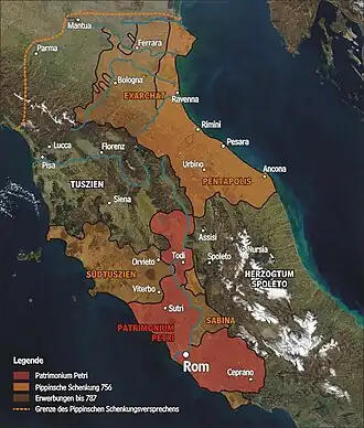- ↑ «Donation of Pippin | Charlemagne, Papal States & Italian History | Britannica». Encyclopædia Britannica (em inglês). Consultado em 3 de janeiro de 2025