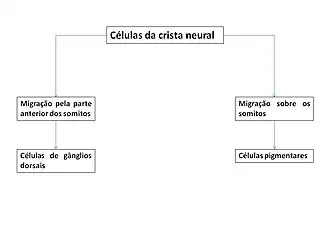 Na imagem, esquema corte transversal de um embrião: (1) Crista Neural, (2) Tubo Neural, (3) Somito dorsal e (4) notocorda. Migração das células da crista neural.