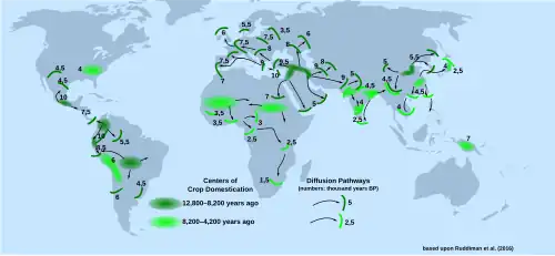 Após a Era do Gelo as florestas se expandiram gradualmente sobre as grandes estepes, provocando a migração e/ou extinção de algumas espécies de animais. Em muitos casos se trataram das espécies que constituíam como parte essencial da dieta do homem. Os grupos humanos, até então caçadores-coletores, tiveram que se adaptar a esta transformação para manter a sua subsistência. Os homens se espalharam em pequenos grupos que começaram a ser semissedentários usando moradias estacionárias. Algumas teorias afirmam que em seu contínuo ir e vir, os caçadores que atiravam as sementes das frutas consumidas podiam ver que, em condições adequadas, estas geravam novas plantas. O resultado dessa transformação é o começo do período Neolítico.[12]