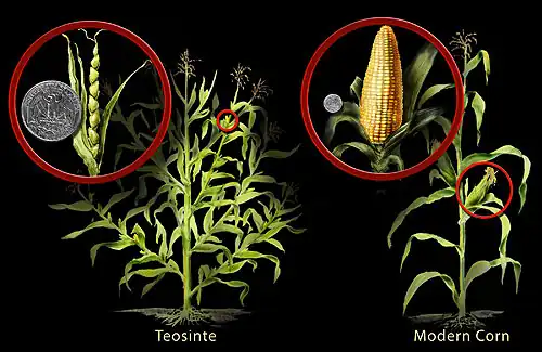 O conceito de domesticação aplica-se tanto a vegetais cultivados como a animais. Na imagem, uma espiga de milho (Zea mays) e o seu ancestral mais provável, o teosinto.