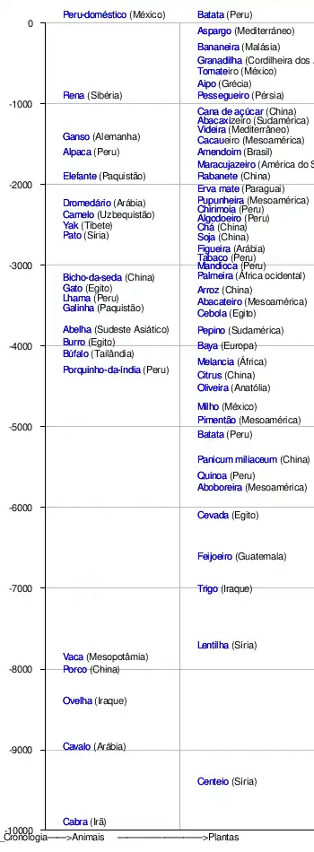 A domesticação não foi realizada simultaneamente em todo o mundo. Estima-se que em cerca de 9 000 anos a.C. se iniciou a Revolução neolítica, na qual o ser humano começou a sedentarizar-se, como um resultado da prática da domesticação e, em seguida, da agricultura. Isso aconteceu no Oriente Médio.