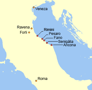 ![]() Em vermelho as cidades da Pentápole, em laranja outras cidades do Exarcado de Ravena | |||||