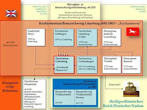 O Estado resultante era conhecida sob muitos nomes diferentes (Brunsvique-Luneburgo, Calenberga, Calenberga-Celle; seu governante era frequentemente conhecido como o "eleitor de Hanôver ". Coincidentemente, em 1701, o Duque de Brunsvique-Luneburgo encontrou-se na linha de sucessão para a Coroa Britânica, posteriormente confirmada em 1707 pelo Ato de União, que posteriormente herdou, criando assim uma união pessoal das duas coroas a 20 de outubro de 1714.