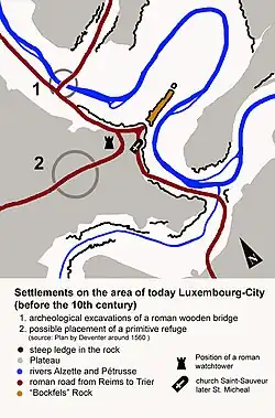 Historiadores contemporâneos sugerem que a etimologia da palavra Luxemburgo deriva de "Letze", um termo que significa fortificação.[3] Este nome poderia se referir aos vestígios de uma torre de vigia romana ou a um antigo refúgio da Alta Idade Média.
