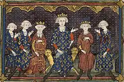 Representação do século XIV de Eduardo I (esquerda) declarando seu filho (direita) como o Príncipe de Gales.