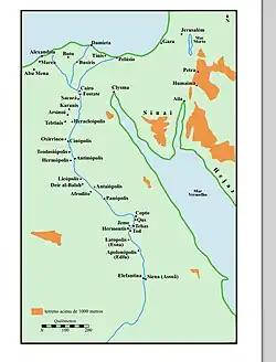 A geografia egípcia é essencialmente definida por um estreito vale ao longo do Nilo, que se estende por cerca de 800 km do Cairo a Assuã, além do triângulo do Delta no norte. A fertilidade do solo, impulsionada pelas inundações do Nilo, permitia uma produção agrícola superior, o que sustentava uma população urbana considerável, especialmente em comparação com outras regiões mediterrâneas. Durante o período romano, o Egito era um pilar fundamental na rede fiscal do Império , com sua produção de cereais sendo vital para o sustento do império oriental.[3]