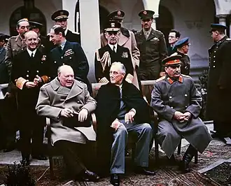 Na Conferência de Yalta (fevereiro de 1945) ficou marcada pelas negociações diplomáticas acerca do mundo pós-guerra, onde são abordadas questões como o tratamento a ser dispensado à Alemanha após a guerra, incluindo sua divisão em zonas de ocupação e a eliminação de sua indústria bélica, e a punição aos criminosos de guerra. Também se decide pela criação do Estado polonês e lançam-se as bases para a criação das Nações Unidas. A URSS concorda em declarar guerra ao Japão após a derrota final da Alemanha, recebendo em troca áreas de ocupação no Leste Europeu e da Lituânia, Letônia e Estônia. Stalin conseguiu a preservação da esfera de influência sob a Mongólia, o retorno da porção meridional das ilhas Sakalinas à União Soviética e também o controle total das ilhas Kuriles e também uma base naval soviética na China.
