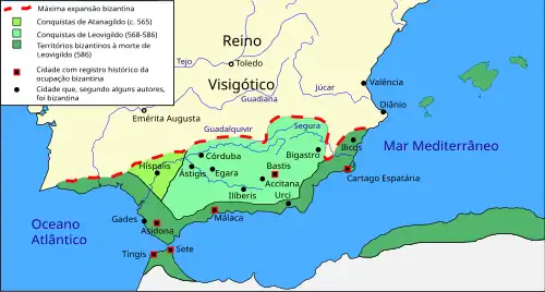 Desde 565, Atanagildo e os seus sucessores, Liúva I e Leovigildo foram acossando com sucessivas campanhas o poder bizantino, que se viu finalmente relegado às cidades do litoral. No fim do reinado de Recaredo I, nos últimos anos do século VI, os visigodos sofreriam algumas derrotas, segundo Isidoro de Sevilha, e Bizâncio conseguiu tomar outras praças interiores, talvez nas atuais províncias de Múrcia e de Almeria.