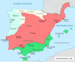 O imperador Justiniano faleceu em 565 e o rei Atanagildo em 567. Foram sucedidos por Justino II, sobrinho do imperador, e o rei Liúva I, respectivamente. O rei Liúva I associou ao trono o seu irmão Leovigildo, falecendo em 572 e ficando Leovigildo como rei. Com ele começaria o fim da província da Espânia. O reinado deste monarca esteve cheio de conflitos militares, políticos e religiosos, que com habilidade conseguiu superar, conseguindo ademais conquistar uma boa parte da província da Espânia.