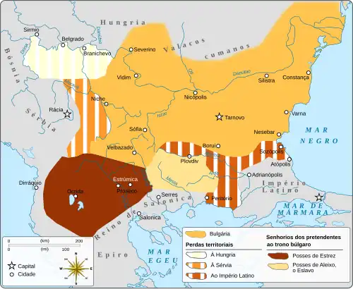 Na época da morte de Joanitzes, Estrácio estava na capital Tarnovo, talvez tentando capitalizar seus direitos ancestrais à coroa búlgara. Porém, Boril se mostrou o candidato mais ambicioso. Ele perseguiu os outros candidatos e Aleixo e os filhos de João Asen I, João Asen II e Alexandre, tiveram que deixar a Bulgária.[7]