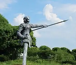 A nova estátua de Etelfleda na parte externa da estação ferroviária de Tamworth, erguida para comemorar 1 100 anos desde sua morte em Tamworth. Sua lança indica para os visitantes a direção para o centro da cidade e o Castelo de Tamworth