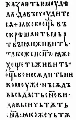 Mais manuscritos russos antigos sobreviveram de Novogárdia, que nunca foi ocupada pelos mongóis, do que de qualquer outro centro.[2] Como outros manuscritos russos medievais, os Evangelhos de Ostromir foram escritos em uma versão local peculiar do eslavo eclesiástico.[3] Por exemplo, a palavra "водоу" ('água') é encontrada em vez da forma acusativa correta do antigo eslavo "водж", e a palavra "дрѫже" ('amigo') é encontrada em vez de "дроуже" no forma vocativa.[3]