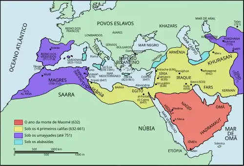 A expansão dos califados árabes ocorreu em diferentes fases, começando imediatamente após a morte do Profeta Maomé, sob a liderança dos primeiros califas: Abacar (r. 632–634), Omar (634–644), Otomão (644–656) e Ali (656–661). Esse período inicial é marcado pelas importantes vitórias militares do mundo islâmico contra os Impérios Bizantino e Sassânida, até então as duas maiores potências da época.[2]