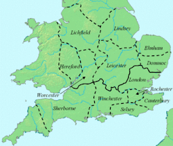 Dioceses da Inglaterra anglo-saxônica. Dommoc, a diocese de Félix, à esquerda.