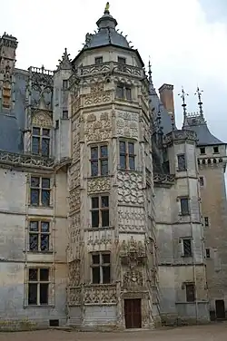 Detalhe da escadaria de Longueville, Château de Châteaudun, mostrando a justaposição do gótico flamboyant e da decoração antiga