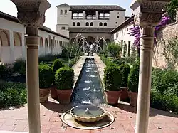 O complexo consiste do Patio de la Acequia (Pátio da Acéquia [Açude/Regueiro/Aqueduto/Canal de Água]), que tem uma longa piscina emoldurada por canteiros de flores, fontes, colunatas e pavilhões, e o Jardim da Sultana ou Pátio do Cipreste. O primeiro é pensado para melhor preservar o estilo do jardim persa medieval em Al-Andalus.