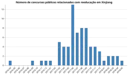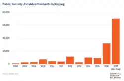 Em particular, os críticos destacaram a suposta concentração de uigures em campos de reeducação patrocinados pelo Estado,[32][33] a supressão das práticas religiosas uigures,[34][35] a doutrinação política,[36] maus tratos graves,[37] e testemunhos de alegados abusos dos direitos humanos, incluindo esterilização forçada e contracepção.[38][39] As estatísticas do governo chinês mostram que, de 2015 a 2018, as taxas de natalidade nas regiões principalmente uigur de Hotan e Kashgar despencaram em mais de 60%.[40] No mesmo período, a taxa de natalidade de todo o país diminuiu 9,69%, de 12,07 para 10,9 por 1.000 pessoas.[41] As autoridades chinesas reconheceram que as taxas de natalidade caíram quase um terço em 2018 em Sinquião, mas negaram relatos de esterilização forçada e genocídio.[42] As taxas de natalidade continuaram a despencar em Sinquião, caindo quase 24% apenas em 2019, em comparação com apenas 4,2% em todo o país.[40]