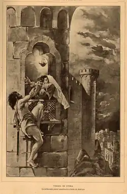O pérfido galego Afonso Henriques, senhor de Coimbra — o maldito de Deus! — conhecia bem a valentia do cão do Giraldo. O pensamento constante deste era tomar à traição as cidades e os castelos, só com a sua gente: ele tinha os muçulmanos da fronteira com o terror das suas armas. Este cão procedia assim: avançava, sem ser apercebido, na noite chuvosa, escura, tenebrosa e, insensível ao vento e à neve, ia contra as cidades inimigas. Para isso levava escadas de madeira de grande comprimento, de modo que com elas subisse acima das muralhas da cidade que procurava surpreender; e quando a vigia muçulmana dormia, encostava as escadas à muralha e era o primeiro a subir ao castelo. E empolgando a vigia dizia-lhe:
