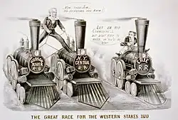 Mas havia também um lado negro.[35] Na década de 1870, as ferrovias foram difamadas por fazendeiros do oeste que absorveram o tema do movimento Granger de que as transportadoras monopolistas controlavam muito o poder de precificação e que as legislaturas estaduais tinham que impor preços máximos. Comerciantes e carregadores locais apoiaram a demanda e conseguiram algumas "Leis Granger" aprovadas.[36] Queixas anti-ferroviárias foram repetidas em alta na retórica política do final do século XIX.[37]