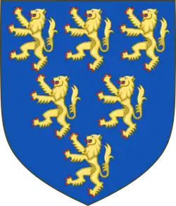 ![]() Efígie esmaltada do túmulo de Godofredo em Le Mans. Seu escudo decorado sugere as origens antigas dos três leões do Brasão real da Inglaterra | |||||