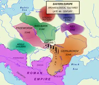 Cultura de Vilemberga (seta em laranja), suposta migração dos godos nos séculos II e III; Cultura de Cherniacove (linha em laranja) no século III e (linha vermelha) no século IV; Cultura de Quieve (linha amarela) nos séculos século III e IV.
