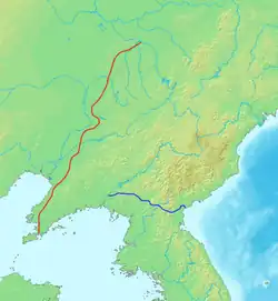 Após o "Incidente da Ponte Manbu" de 942, Goryeo se preparou para um conflito com o Império Quitai: Jeongjong estabeleceu uma força de reserva militar de 300.000 soldados chamada "Exército Resplandecente" em 947, e Gwangjong construiu fortalezas ao norte do Rio Chongchon, expandindo-se em direção ao Rio Yalu. [94] [95] No entanto, uma tentativa de controlar a bacia do rio Yalu em 984 falhou devido ao conflito com os Jurchens. [96] Os Khitans consideraram Goryeo uma ameaça potencial e, com o aumento das tensões, invadiram em 993. [97] Os Jurchens avisaram Goryeo sobre a invasão duas vezes. A princípio, Goryeo não acreditou na informação, mas, após o segundo aviso, mudou de ideia e adotou uma estratégia defensiva. Os coreanos foram derrotados em seu primeiro encontro com os Khitans, mas conseguiram deter seu avanço em Anyung-jin (na moderna Anju, província de Pyongan do Sul), no rio Chongchon. [96] [98] [99] As negociações começaram entre o comandante de Goryeo, Sŏ Hŭi, e o comandante de Liao, Xiao Sunning. Concluindo, Goryeo entrou em uma relação tributária nominal com Liao, rompendo relações com Song, e Liao reconheceu a soberania de Goryeo sobre as terras a leste do Rio Yalu. Goryeo ficou livre para lidar com os Jurchens ao sul do Yalu e em 994-996, Sŏ Hŭi liderou um exército para a área e construiu fortes. [96] [97] Posteriormente, Goryeo estabeleceu os "Seis Assentamentos de Guarnição a Leste do Rio" no seu novo território. [96] [95] [100] Em 994, Goryeo propôs a Song um ataque militar conjunto a Liao, mas foi recusado; [101] anteriormente, em 985, quando Song propôs um ataque militar conjunto a Liao, Goryeo recusou. [97] Por um tempo, Goryeo e Liao desfrutaram de um relacionamento amigável. [96] Em 996, Seongjong casou-se com uma princesa Liao. [102]