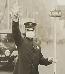 Policial utilizando máscara enquanto regula o tráfego rodoviário em Nova Iorque, em outubro de 1918.