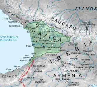 Em 550, uma revolta pró-persa eclodiu entre os abasgos, um povo que vizinhava Lázica ao norte. Isto proporcionou a oportunidade para um nobre laze de alto estatuto, chamado Terdetes, que havia confrontado Gubazes, entregar para os persas um importante forte na terra dos apsílios, uma tribo sob suserania laze. Os apsílios retomaram o forte, mas recusaram-se a aceitar o governo laze até serem persuadidos a fazê-lo pelo general bizantino João Guzes.[19][20] Em 551, os bizantinos finalmente tomaram e arrasaram Petra, mas um novo exército sob Mermeroes foi capaz de estabelecer controle persa sobre a parte oriental de Lázica. As forças bizantinas em Lázica retiraram-se para oeste, à boca do rio Fásis, enquanto os lazes, incluindo Gubazes e sua família, procuraram refúgio nas montanhas. Apesar de resistirem a duras condições no inverno de 551/552, Gubazes rejeitou as ofertas de paz transmitidas pelos enviados de Mermeroes. Em 552, os persas receberam reforços substanciais, mas seus ataques às fortalezas mantidas pelos bizantinos e lazes foram repelidos.[21][22]