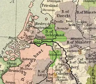 O Ducado de Gueldres incluía não apenas partes das atuais províncias neerlandesas de Guéldria e Limburgo, como também territórios do atual estado alemão da Renânia do Norte-Vestfália.