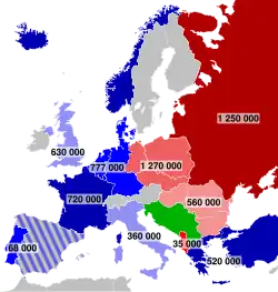 Os territórios da Europa Central e Oriental libertados da Alemanha nazista e ocupados pelas forças armadas soviéticas foram adicionados ao Bloco Oriental e convertidos em Estados satélites.[54]