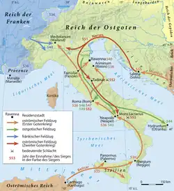 Na segunda fase do conflito, desde a chegada de Belisário, o número de soldados bizantinos na Itália tornou-se cada vez mais fraco devido às perdas sofridas às mãos do rei godo Tótila e pelas deserções em massa.[6] Por outro lado, o exército godo tinha-se tornado bastante numeroso, com um significativo aumento de tão somente 1 000 soldados, em 540, para 15 000, em 552.[7] Em 552, Justiniano, constatando que a situação na Itália estava muito crítica, destituiu Belisário e transferiu o comando para Narses, confiando-lhe um exército de cerca de 20 000-30 000 homens, com o qual o general pôde derrotar o primeiro exército de Tótila (uma força de 15 000 godos contra os 25 000 soldados bizantinos) na batalha de Tagina, na qual o rei ostrogodo foi morto. Em outubro de 553, Teia, o novo rei ostrogodo, caiu numa emboscada de Narses naquela que ficou conhecida a batalha do Vesúvio, pondo fim ao reinado dos godos.