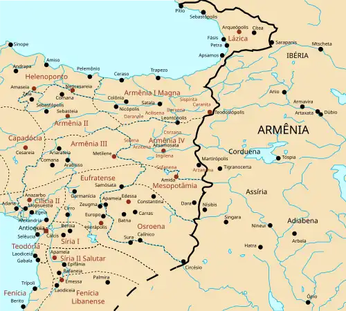 ![]() Fronteira oriental do Império Bizantino em 565 Lázica está no canto superior direito, na costa do Mar Negro, na fronteira com o Reino da Ibéria, sob o controle sassânida. | |||