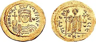 A magnanimidade e campanhas do imperador Tibério II (r. 574–582) eliminaram o excedente do tesouro deixado desde a época de Justino II (r. 565–574).[8][9][10] A fim de gerar uma reserva no tesouro, Maurício instituiu estritas medidas fiscais e cortes no pagamento do exército que ocasionaram quatro motins.[11] O motim final, em 602, resultou numa ordem para que as tropas nos Bálcãs deixassem a região durante o inverno.[12] O exército proclamou Focas, um centurião trácio, como imperador.[3][13] Maurício tentou defender Constantinopla armando os Azuis e os Verdes - dois dos principais times de corrida de bigas do Hipódromo - mas eles provaram-se ineficientes. Ele fugiu mas foi logo interceptado e morto pelos soldados de Focas.[14][15][16][17] Focas apossou-se do trono em novembro.[18]