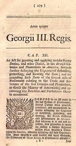 Ao fim da Guerra dos Sete Anos, em 1763 (e a Guerra Franco-Indígena), o Reino Unido da Grã-Bretanha emergiu triunfante contra a França na América do Norte, mas terminou muito endividado. Os impostos na Inglaterra já estavam muito altos e foi decidido que os colonos americanos deveriam contribuir mais. O Parlamento da Grã-Bretanha então aprovou a Lei do selo de março de 1765, que colocou uma taxação direta sobre as colônias que começou formalmente em 1 de novembro. O novo imposto irritou os colonos americanos, que argumentavam que os seus "direitos como ingleses" significavam que novos impostos não podiam ser cobrados deles, pois eles não tinham representação no Parlamento.[8] Naquele momento, na verdade, muitos colonos rejeitavam a solução de representatividade afirmando que suas "circunstâncias locais" tornavam isso impossível.[9][10]