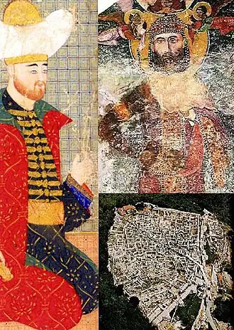 ![]() Em sentido horário a partir do alto, à direita: czar João Alexandre, ruínas da fortaleza de Shumen, sultão Bajazeto I | |||