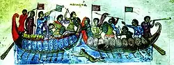 - ↑ A liderança árabe cedo compreendeu que necessitava de uma armada naval para estender as suas conquistas. A marinha bizantina sofreu uma derrota decisiva frente aos Árabes na chamada batalha dos Mastros (de Fênix nos registos bizantinos e Dhat al-sawari nos registos árabes), travada ao largo da costa de Fênico, na Lícia, quando ainda era a força naval mais poderosa do Mediterrâneo. Teófanes, o Confessor relatou que a perda de Rodes no mesmo texto em que descreve a venda para sucata dos restos com vários séculos de idade do Colosso em 655.[38][39]