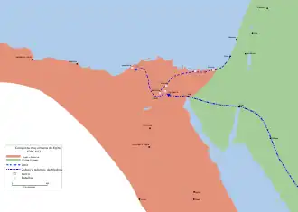 À data da morte de Heráclio, grande parte do Egito tinha sido perdido pelos Bizantinos e em 637-638, toda a Síria estava subjugada pelos exércitos do Islão.[g] A primeira incursão árabe no Egito ocorreu no final de 639 ou início de 640, quando Anre ibne Alas partiu da Palestina comandando entre 3 500 e 4 000 soldados. A estes foram-se juntando progressivamente mais tropas, nomeadamente 12 000 homens de Zobair ibne Alauame. Anre começou por sitiar e conquistar a Fortaleza de Babilónia, no que é atualmente o Cairo e depois atacou Alexandria. Os Bizantinos, divididos e chocados com a perda repentina de tanto território, acederam em entregar a cidade em setembro de 642.[29] A queda de Alexandria marcou a extinção do domínio bizantino no Egito e abriu o caminho aos muçulmanos para a conquista da Cirenaica.[30] Em 644, após a morte de Omar (r. 634–644), Otomão (r. 644–652) sucede-lhe como califa.[31]