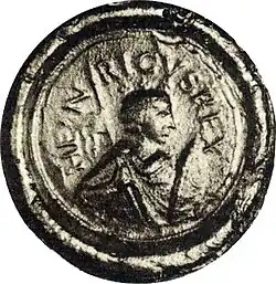 Selo de Henrique em um documento de 30 de março de 925. Ele é retratado como um guerreiro, com lança e escudo. As palavras são HEINRICUS REX (Rei Henrique). | |||||