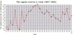 O domínio da Companhia Britânica das Índias Orientais sobre o subcontinente indiano trouxe grandes mudanças nas políticas tributária e agrária, que tenderam a promover o comércio agrícola, causando a diminuição da plantação de gêneros alimentícios, o empobrecimento das massas, a perda de terras pelos fazendeiros e escassez alimentar.[17] A política econômica inglesa na Índia causou um severo declínio no artesanato e no setor têxtil, devido à redução da demanda e ao aumento do desemprego.[18] Após a remoção das restrições internacionais pelo Ato de 1813, o comércio indiano expandiu-se substancialmente.[19] O resultado foi uma significativa transferência de capital da Índia para a Inglaterra, que, devido à política colonial dos ingleses, levou a uma fuga maciça de receita ao invés de qualquer esforço sistemático de modernização da economia nacional.[20]