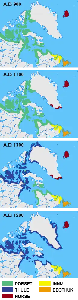 Por volta de 1200, se estabeleceu outra cultura ártica, os Thule, que chegaram do oeste e que haviam chegado à América 200 anos antes pelo Alasca. Se assentaram ao sul da cultura Dorset ocupando amplas áreas na costa leste e oeste de Groenlândia. Estes são os ancestrais dos inuítes atuais, tinham facilidade de adaptação e caçavam qualquer presa disponível em terra ou mar. Costumavam armazenar grandes quantidades de alimentos para evitar a fome durante o inverno. Os primeiros Thule evitaram as altas latitudes, as quais só foram povoadas com a chegada de novas migrações a partir do Canadá no século XIX.