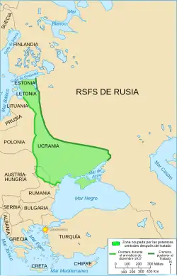 Após a derrota da Alemanha, invadiu os territórios cedidos anteriormente e denunciou o Tratado de Brest-Litovsk, mas os Aliados responderam aumentando o auxílio aos contrarrevolucionários e as tropas tchecas, turcas e britânicas colaboraram com os russos brancos e os cossacos com fins de restauração monárquica.