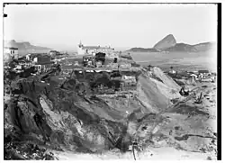 A cidade de "São Sebastião do Rio de Janeiro" foi fundada por Estácio de Sá em 1° de março de 1565, quando desembarcou num istmo entre o Morro Cara de Cão e o Morro do Pão de Açúcar, erguendo uma paliçada defensiva. Foi a segunda cidade do Brasil, depois de Salvador, fundada em 1549 (antes só havia vilas e aldeias na colônia). O nome era uma dupla homenagem a D; Sebastião, o rei-menino, monarca de jure de Portugal, e a São Sebastião, a quem se atribui um milagre que culminou na fundação da cidade. Na região da Praia Vermelha, Estácio também mandou erigir a igreja de São Sebastião, o primeiro templo religioso da cidade, embora feito de pau a pique.[9]