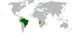 Topónimos como Serra Leoa,[53] Lagos (Nigéria), Elmina (Gana), Ano Bom, Natal, Gabão, Camarões, Brasil, Cochinchina,[54] Formosa (Taiwan), Flores (Indonésia) atestam a passagem dos portugueses no século XVI. Várias palavras portuguesas entraram no léxico de outras línguas, tais como "sepatu" (sapato) em indonésio, "keju" (queijo) em malaio, "meza" (mesa) em swahili, "botan" (botão), "kompeitō" (confeito), "kappa" (capa), entre várias palavras japonesas de origem portuguesa. Simultaneamente foram importadas para a Europa palavras ligadas à marinharia e a produtos exóticos como banana, albatroz, cachalote, caju, crioulo, garoupa, sargaço, junco (navio), macaco, mandarim,[55] monção, pagode. Hoje, a maioria dos falantes do português encontram-se no Brasil, na América do Sul.