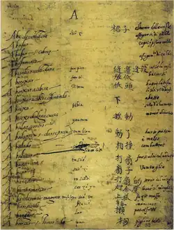 Página do manuscrito do Dicionário Português-Chinês, compilado por Matteo Ricci e Miguel Ruggieri, 1583-1588.