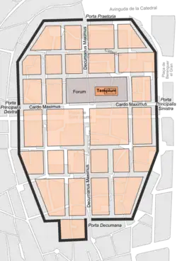 O fórum era a praça central dedicada à vida pública e aos negócios. Situava-se na confluência entre o Cardo Máximo e o Decúmano Máximo]], aproximadamente no centro do recinto amuralhado. No fórum concentravam-se as construções dedicadas aos negócios, a justiça, as termas ou banhos públicos, etc, e era o lugar onde as autoridades se reuniam na Curia e na Basilica. O recinto do fórum não estava claramente delimitado, mas parece que coincidia aproximadamente com a actual praça de Sant Jaume.