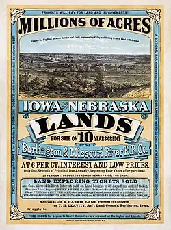 A década de 1870 viu 204.692 imigrantes nascidos no exterior em Iowa, com 261.650 e 324.069 em 1880 e 1890, respectivamente.[59] A competição entre os estados por imigrantes estava aumentando durante esse tempo, levando Iowa a tomar certas medidas para atrair imigrantes.[68] O Conselho de Imigração do Estado de Iowa foi criado em 1870 e começou a imprimir materiais promocionais.[68] Um livreto notável era intitulado Iowa: The Home of Immigrants.[69] A publicação deu descrições físicas, sociais, educacionais e políticas de Iowa. A legislatura instruiu que o livreto fosse publicado em inglês, alemão,[70] holandês, sueco e dinamarquês.[71]