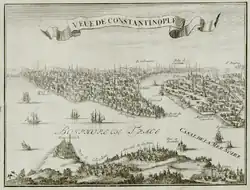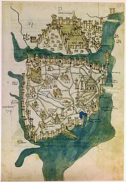 Desde o século V que Teodósio II erigiu uma fortaleza, teve um subúrbio na orla contrária do Corno de Ouro: Gálata ou Pera. E desde o século XIII foi lugar de assentamento de comerciantes genoveses e no 1348 foi erguida a Torre de Gálata em sua muralha defensiva.Miniatura de Constantinopla no século XVkulesi.jpg Imagem da Torre Gálata[ligação inativa].